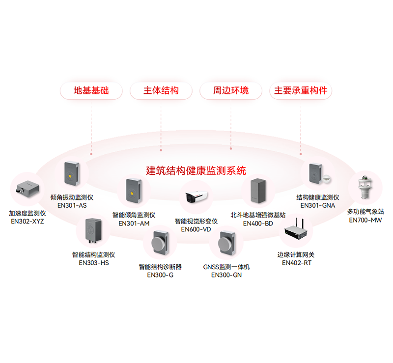 實時監控建筑結構健康狀態,通過位移、沉降、傾斜、溫濕度、裂縫和動態平衡、自振頻率的數據收集分析,對潛在災害進行提前預警,對突發事件應急報警,為結構坍塌監測預警分析和滑坡監測預警分析提供數據支撐,實現對建筑健康狀態的實時評估。